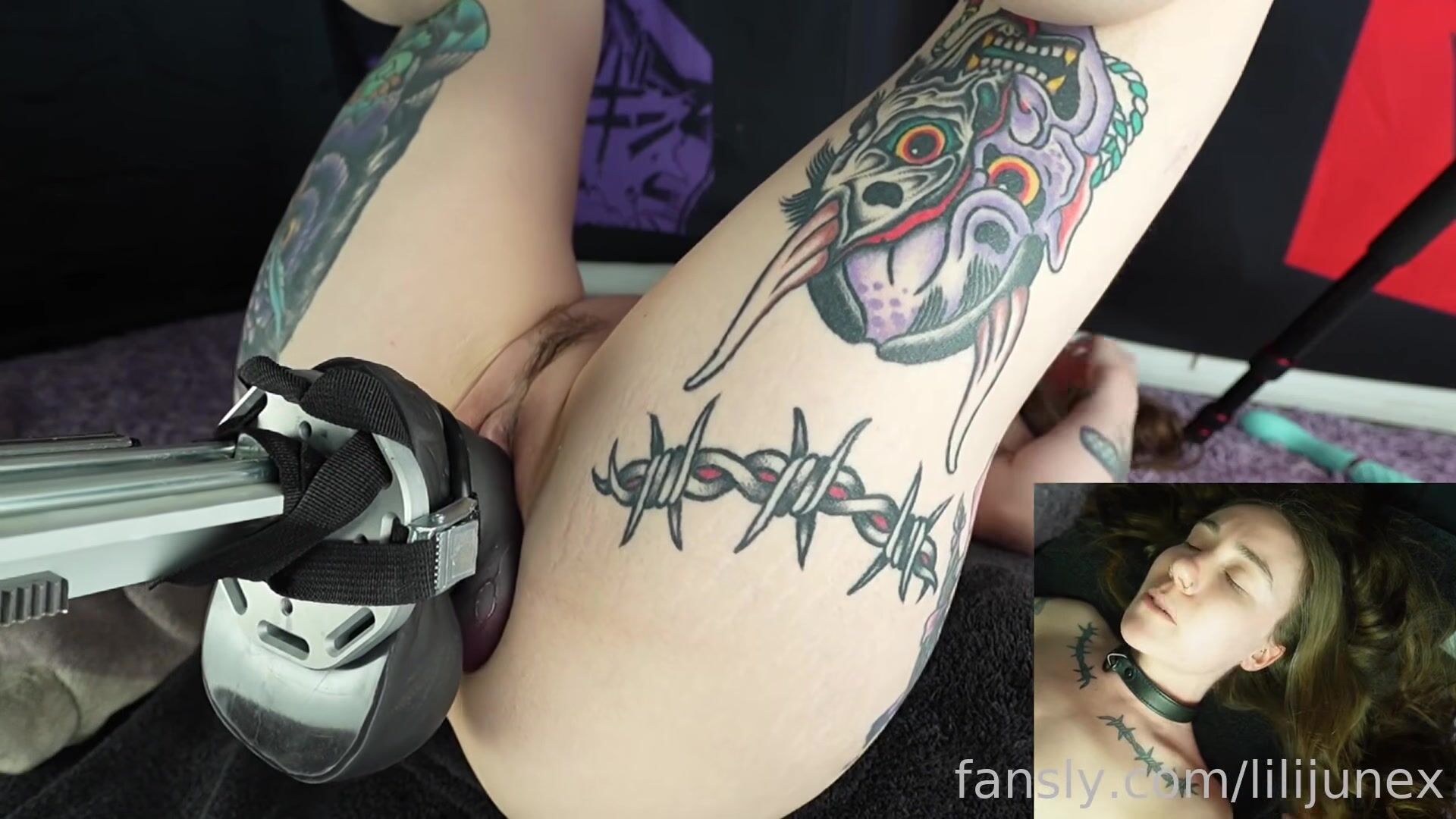 PORNtube - Гигантская дилдо-машина разъебывает татуированную киску — она визжит, кончает и снимает всё сама